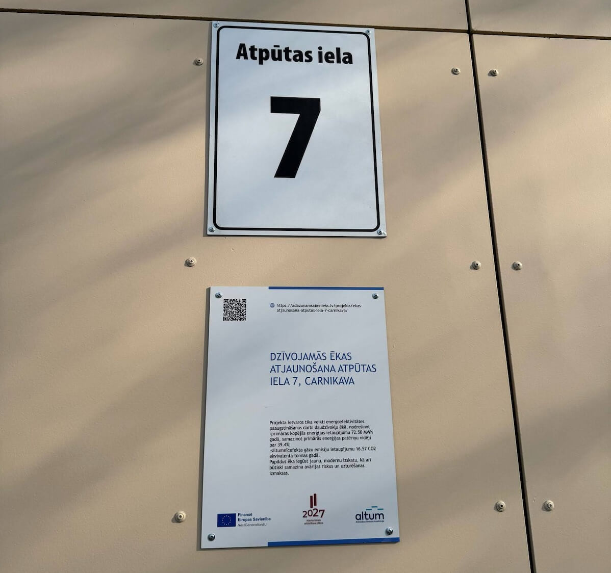 2024.gada jūlijā daudzdzīvokļu dzīvojamās mājas Atpūtas ielas 7, Carnikava mājas iedzīvotāji ir nobalsojuši par daudzdzīvokļu dzīvojamās mājas atjaunošanu un pārbūvi darbības programmas „Eiropas Savienības Atveseļošanas un noturības mehānisma plāna 1.2. reformu un investīciju virziena “Energoefektivitātes uzlabošana” 1.2.1.1.i. investīcijas “Daudzdzīvokļu māju energoefektivitātes uzlabošana un pāreja uz atjaunojamo energoresursu tehnoloģiju izmantošanu”.